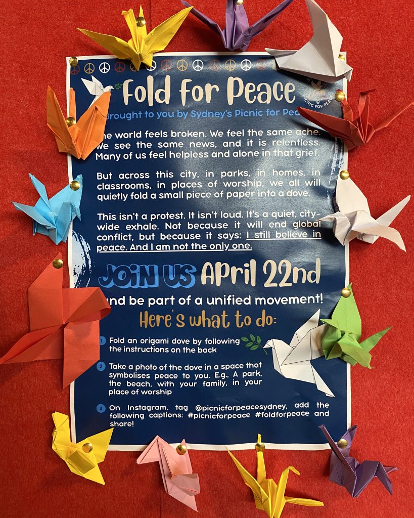 This is why Fold for Peace, an initiative of the Justice and Peace Office of the Archdiocese of Sydney, feels so significant. The invitation is simple: to fold an origami dove, capture a photo of yourself or your community with their doves in a place that is ‘peaceful’ to you, and to share that moment with others on social media. Behind the simplicity of this task is something much deeper. It is a reminder that peace is something we create with our own hands. It is fragile, yes – but it is also something we can shape, nurture and offer to the world.